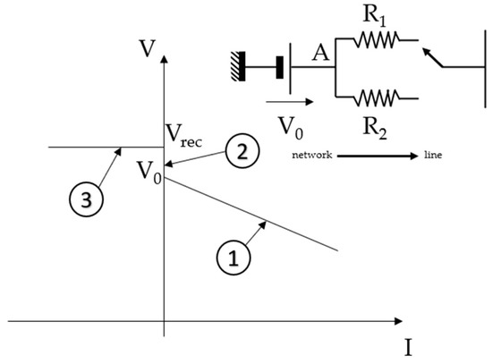 - Electric substation: Figure 2 shows the V-I characteristic and the equivalent circuit adopted for a typical Substation. When the Substation is disconnected (zone 2), at node A is imposed the P = 0 condition. In supply or regeneration status, the node is set with the V = V0 condition (no-load output voltage) or V = Vrec (network recovery voltage) and the equivalent resistance R2 or R1 is introduced, respectively, for the different voltage drop in the inverter and rectifier bridges.