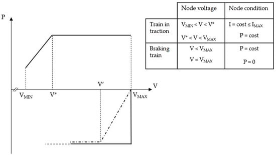 Figure 3. V-P characteristic of traction vehicles. - Braking vehicles: if the system is receptive, all the power is fed into the traction line, as long as the node voltage, resulting from the solution of the system of equations, allows it. In fact, if the Vmax value is reached, only a portion of the recoverable power is fed into the line. This voltage is a non-linear function of the voltage in the nodes and in the network conductances. The difference between the recoverable power and that actually recovered represents the power dissipated on the braking resistors.