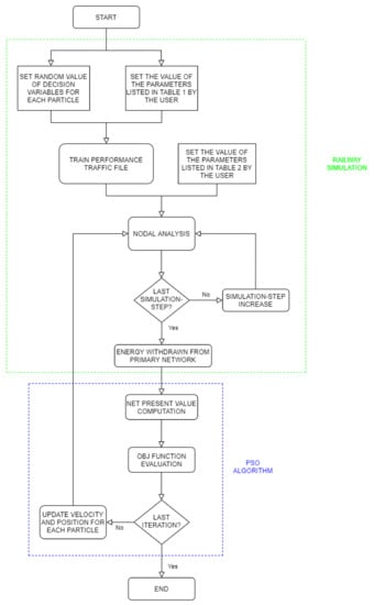 Particle swarm optimization (PSO) is a heuristic algorithm inspired by the choreography of a flock of birds [41]. In the space of real numbers, every single possible solution is modeled as a particle moving through the hyperspace of the problem. At each iteration, the velocities of individual particles are stochastically adjusted based on the best historical position for the particle itself and the best position in the neighborhood. Both the best particle and the neighborhood best one are found based on a user defined fitness function. The flow chart of the integration of the simulation software with the proposed PSO algorithm for the positioning and dimensioning is shown in Figure 4. The characteristics of the route and those of the rolling stock (expressed in Table 1) are provided as input to the software described in Section 2.1. The power supplied by the supply line is then estimated by calculating the consumption of the vehicle. The traffic file produced is the input to the electrical calculation software described in Section 2.2 (together with the other values listed in Table 2 which are entered by the user) who is able to calculate the energy supplied by the substations for a particular configuration of location and sizing. The objective function in Equation (21) is thus calculated and finally, the PSO returns a feasible and better solution than the original one.