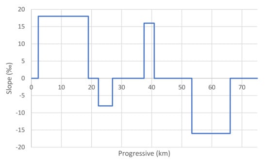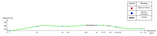 Figure 5 shows the line: on the x-axis there is the kilometric progressive, while on the y-axis there is the height above sea level. The green line shows the planimetric profile of the railway line, which has a length of 75.1 km. Railway stations are highlighted with red circles while the electric substations along the route are highlighted with blue circles.
