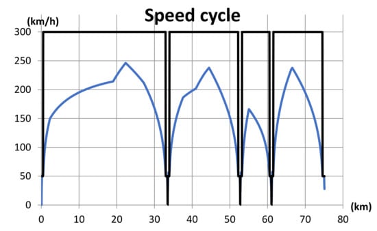 where Lmax is the track length, VLINEmin and VLINEmax are the minimum and maximum allowable line voltage values, IESS, VESS and SoCESS are the current, voltage, and SoC of to the ESS, respectively calculated using the software described in Section 2.2 [37,38,39]; each of them is limited to its minimum and maximum value.