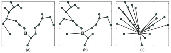In order to reach a sub-optimal solution, the input parameters should be explored. As mentioned before, the slime mold algorithm finds the shortest path between nodes, so that the network solution gradually approaches MST. However, by relaxing the parameters, the topology can step back from the MST (Figure 2a) towards the star topology (Figure 2c). A balance between the smallest total length and smallest loss costs can be achieved as shown in Figure 2b.