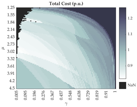 In order to achieve a suitable topology, the input parameters: flow feedback rate and tube decay rate must be explored to obtain a balanced spanning tree. Typically, a desired result corresponds to a rather high and low , while the intervals of the two are and . The flow feedback rate is the main parameter that governs tube formation dynamics [37,38]. Values of lower than one will prevent the model from convergence, leaving many alternative connections between sink and source. Exceeding the upper bound will result in breaking some of the node connections, leaving some of the sink nodes disconnected. The upper limit of , however, can vary slightly depending on the size of the network. The tube decay rate has an opposite effect on the slime mold dynamics. A value of around the upper bound will result in a star topology with direct connections between source and sink nodes. By decreasing , the network topology will gradually approach the MST. The tube decay rate is characterised in [39] as the light-avoidance behaviour of slime mold organism and it affects the result to a great extent. The heatmap of the total cost dependency on the input parameters can be seen in Figure 3, where the cost is normalised by the cost of the MST of the network shown in Figure 2. The NaN values on the top-left corner of the plot indicate that the model did not converge.