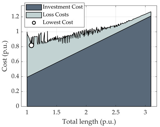 The split of normalized costs of the previously considered network can be seen in Figure 4. With one cable size considered, the investment cost grows linearly with the increased total length of a network. The loss costs, however, have a nonlinear dependence on the total length. The loss costs are smallest at the star-like topology and increase in an abrupt manner when approaching the MST. Typically, the lowest cost is close to that of the MST, but not exactly.
