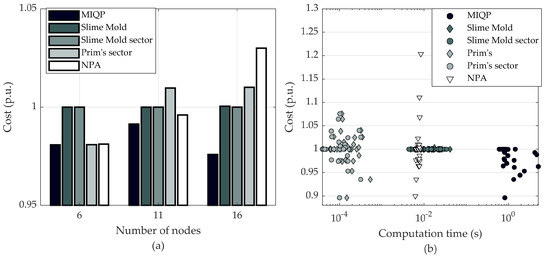 The results of rural networks are shown in Figure 6a, where costs are normalized by the corresponding result of the Slime Mold sector. At a low number of nodes, all algorithms and their variations show similar cost values. The MIQP model represents the global minimum, which is reflected in the lowest cost in all the cases, as well as on average. Slime mold delivers worse results compared to the Prim’s MST. At the smallest network size, the optimal topology is equal to the MST, and slime mold relaxation of the MST yields no benefits. However, once the number of nodes in a network start to increase, the benefit starts to be noticeable. Moreover, the expediency of initial solutions in the case of such small networks is questionable. Modern computers and optimisation tools will reach the global optimum in a reasonable time.
