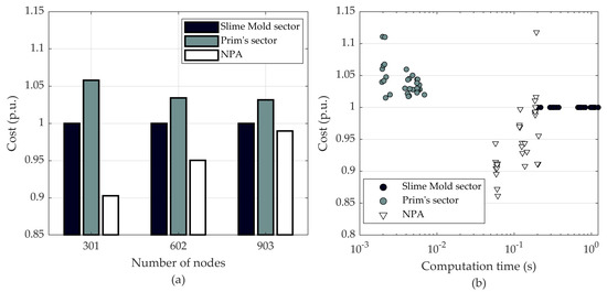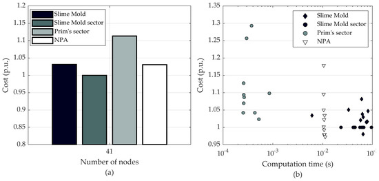 The number of nodes is increased up to 41 in the intermediate networks. Starting from such a scale, the advantage of sectored slime mold is starting to become evident (Figure 7a). The number of customers in intermediate networks is big enough to overload a single feeder. The clustering algorithm divides loads into at least two sectors, creating a feeding cable for each. The disadvantage of MST starts to stand out at this size of network, as the Prim’s algorithm shows a 10% higher cost on average. The unsectored Prim’s algorithm was left out from the comparison due to poor results.