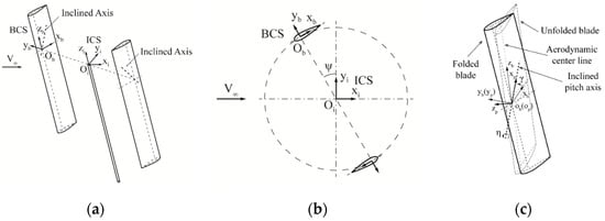 For a blade with an inclined pitch axis, description of the blade folding movement includes three Euler angles in BCS: pitch angle () around negative z axis, flap angle () around negative x axis, and edge angle () around y axis. Three angles are calculated as follows: