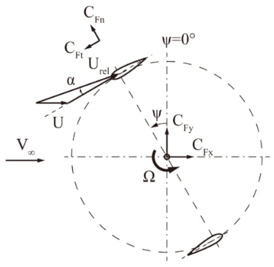 where is the virtual incidence angle, is the turbine rotational speed, and is the normalized blade attachment point (the origin is the aerodynamic center and the direction is from the trailing edge to the leading edge).