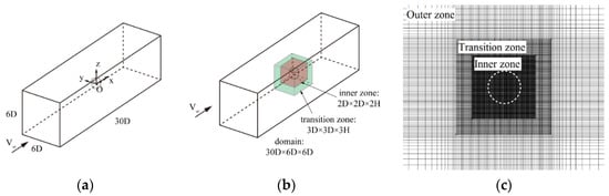 In the present study, commercial CFD software ANSYS Fluent is utilized with user defined functions (UDF) to conduct the simulation. The computational domain sizes are set to be as shown in Figure 4a. The turbine is placed at the center of the domain so that the global coordinate system coincides with the ICS of the wind turbine. The inlet boundary is a uniform velocity of 8 m/s with a turbulence intensity of 5% and the outlet boundary is a zero gauge pressure outlet. Translational periodic conditions are imposed in the lateral boundaries while symmetry ones are imposed in the top and bottom boundaries. Hexagonal mesh is generated in ANSYS ICEM CFD. The whole domain is divided into three zones, an inner zone with a size of , a transition zone with a size of , and an outer zone (Figure 4b). Elements in the inner zone have a minimum size of while those in the outer zones have a large size of and grow larger to the boundaries (Figure 4c). Hanging nodes are imposed at the interface between zones. The total number of elements is 1,967,560; the mesh sensitivity is analyzed below.