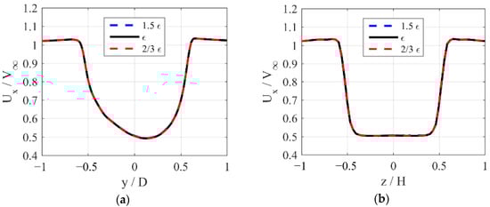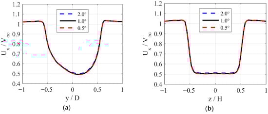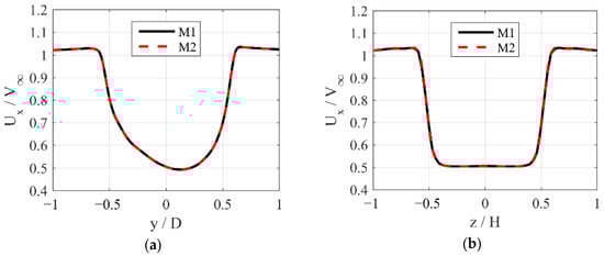 A spatial discretization sensitivity analysis is carried out on two meshes, a basic mesh M1 whose parameters are mentioned above, and a refined one M2 with the same topology but smaller element size. The minimum element size in M2 is and the total number of elements of M2 is 3,560,482, almost twice that of M1. Results of aerodynamic forces with two meshes are in good agreement, with less than a 1.0% relative error of the average tangential force coefficient. The flow field is examined by extracting two profiles of the streamwise velocities (normalized by the freestream velocity) at x/D = 1 downstream, a horizontal one where z/H is 0 and y/D is −1 to 1, and a vertical one where y/D is 0 and z/H is −1 to 1. From Figure 5, it is clear that velocities of the wake simulated by two meshes are very close. The errors of normalized average streamwise velocities in two meshes are 0.1% (horizontal profile) and 0.2% (vertical profile). Based on this mesh sensitivity analysis, the mesh M1 is found to be capable to obtain satisfying computational accuracy. Therefore, the mesh M1 is selected for the rest of simulations.