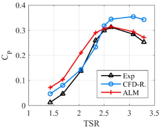 The first validation study focuses on power coefficients () of a VAWT. Simulation results using ALM are compared with experiments by Castelli et al. [45] and simulations using CFD by Rezaeiha et al. [46]. Geometric and operational parameters of the wind turbine are listed in Table 1, Case 1. The results are shown in Figure 8. As can be seen, the curve calculated by the present method is generally coincident with that of experimental data, especially the peak of the curve at the optimal tip speed ratio. However, relatively large differences exist at low tip speed ratios, which may result from errors of the dynamic stall model and exclusion of aerodynamics of supporting structures of the wind turbine.