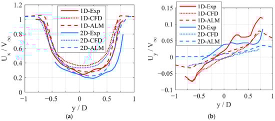 The second validation study focuses on the flow field of a VAWT. Streamwise and lateral velocities at x/D = 1, 1.5, and 2 in the wake on the equator of the wind turbine are compared with those measured by Tescione et al. [2] and CFD simulation by Rogowski [47] (Figure 9). Geometric and operational parameters of the wind turbine are listed in Table 1, Case 2. For streamwise velocities, the maximum deficits of the profiles in the wake are simulated close to experimental data while the breadth of deficits is somewhat underestimated. As for lateral velocities, values are generally underestimated, but in view of the fact that values of lateral velocities are one order of magnitude lower than the freestream velocity, obvious relative errors are reasonable.