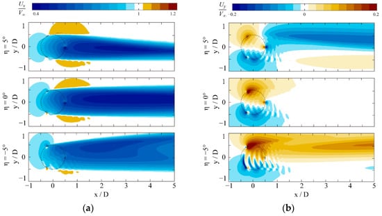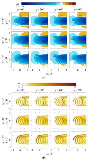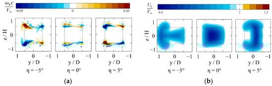 Deficits of streamwise velocities are skewed towards the centerplane at y/D = 0 with . In the contrary, deficits are skewed towards the windward side with . Moreover, vorticities are stronger in the fore half with , resulting in stronger blade–vortex interaction.