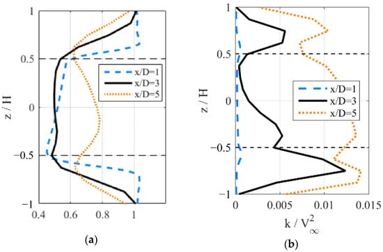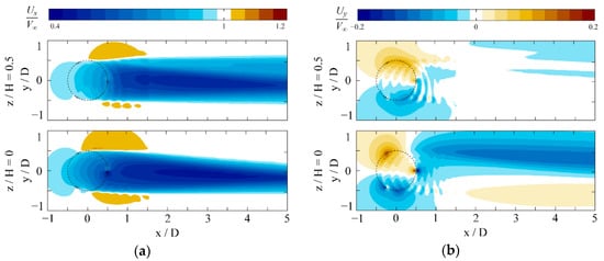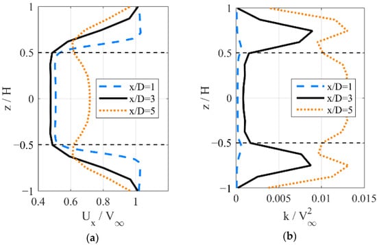 In terms of flow fields on the x–z planes, asymmetry can be observed because of the flapwise angle (Figure 22 with ). For streamwise velocities, deficits in the lower side of blades are larger than those in the upper side in the near wake, but recovery in the lower side is faster in the far wake. At x/D = 1, the velocity of 0.45 at z/H = −0.5 is 25% lower than that of 0.60 at z/H = 0.5 (Figure 21). At x/D = 3, the velocities are close to uniform in the shadow of the blades, and at x/D = 5, the maximum recovery of 0.78 appears at z/H = 0.13, near the middle of the lower side. Turbulence kinetic energy is much stronger in the lower side than that in the upper side. Peaks in the lower side are 55% and 26% higher than those in the upper side at x/D = 3 and 5, respectively. As for lateral velocities and vertical velocities, asymmetry is not quite clear. Tip vortices are trapezoidally distributed, corresponding to the shape of folded blades.