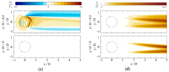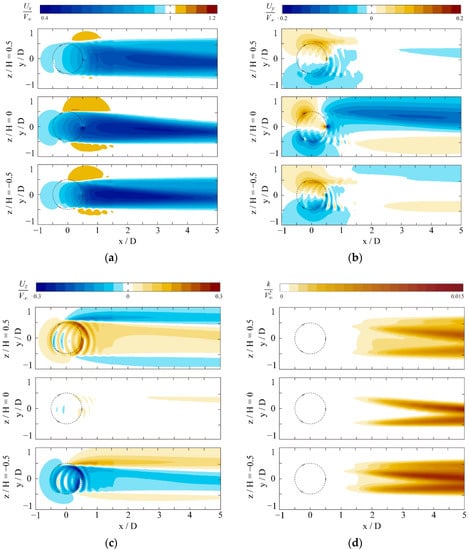 Contours of normalized fluid parameters on horizontal planes with : (a) streamwise velocities; (b) lateral velocities; (c) vertical velocities; (d) turbulence kinetic energy.