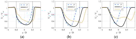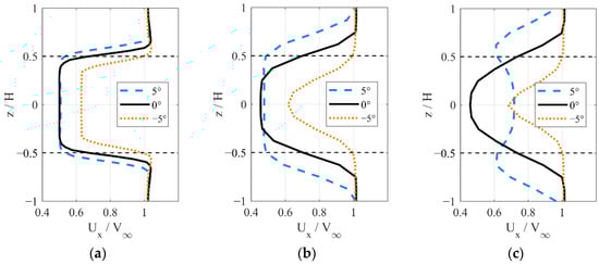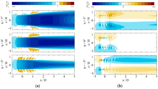 As for flow fields on x–z planes, distinct differences can be seen in the contours of Figure 16. For streamwise velocities, as is mentioned before, maximum velocity deficits are close under conditions of and 0°, greater than those with . The vertical breadth of deficits with becomes larger in the wake while that with slightly decreases (Figure 17), which can be explained by vertical velocities. Flows with are from equators to both sides in the vertical planes, resulting in the spread of deficits, and flows with are in the opposite direction, narrowing the range of variables. The phenomena can also be seen for turbulence kinetic energy and vorticities. In addition, under conditions of and −5°, minimum streamwise velocity recovery in the wake is on the equators, which is quite different with . Obvious velocity acceleration is seen outside of blade tips in the fore half with . Lateral velocities with are in the opposite direction to those with because of the trailing tip vortices of blades in the opposite direction.