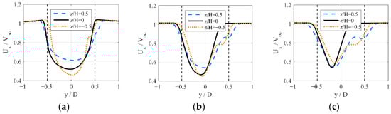 Normalized streamwise velocities on horizontal planes with : at (a) x/D = 1; (b) x/D = 3; (c) x/D = 5.