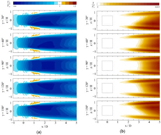 Contours of normalized fluid parameters on x–z planes at y/D = 0 with various incline angles: (a) streamwise velocities; (b) turbulence kinetic energy.