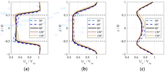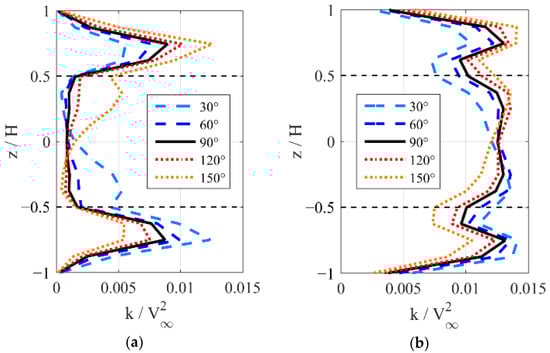 As for flow fields on x–z planes in Figure 22, asymmetry is strengthened along with the incline angle away from 90°. For streamwise velocities, when the incline angles are away from 90°, velocity deficits get larger and brought forward in the wake, and the recovery becomes larger, too. At x/D = 1 in the shadow of blades, streamwise velocities are monotonically distributed, as the lower value corresponds to smaller trajectories. The differences of the velocity between z/H = 0.5 and z/H = −0.5 are 0.15 , 0.06 , 0, −0.06 , and −0.15 with , 60°, 90°, 120°, and 150°, respectively (Figure 23). At x/D = 3, deficits become uniform under conditions of various incline angles, and at x/D = 5, the situations are reversed. Smaller trajectories correspond to higher velocity recovery. Maximum recovery reaches 0.78 and 0.73 at z/H = −0.13 with and 60°, 9% and 2% higher than that with . For turbulence kinetic energy, differences between two peaks outside of the blade tips increase when the incline angles are away from 90°. They reach 76% and 28% of values with at x/D = 3 and 5 when the incline angle is 30° (Figure 24). At x/D = 3, large turbulence kinetic energy appears in the lower side of the shadow of the blades with compared to that with . Similar phenomena can be found with . For lateral velocities and vertical velocities, asymmetry is not quite clear, and tip vortices are distributed corresponding to the shape of folded blades.