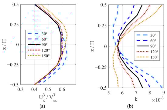Furthermore, the wake on y–z planes at x/D = 5 are assessed. It is clear that the distribution of velocity deficits and turbulence kinetic energy is effected by the shape of folded blades. The maximum velocity deficits of 0.48 are located at z/H = 0.25 and −0.25 with and 150°, respectively. Wind energy in the shadow of the wind turbine is estimated by the integral of the cube of streamwise velocities normalized by the freestream velocity and variations in the vertical direction, as shown in Figure 25. The maximum estimated wind energy with reaches 0.59 on the equator while that with and 150° reaches 0.64 at z/H = −0.13 and 0.13, 7.5% higher than the former. The total estimated wind energy in the lower half (at z/H < 0) with is 8.1% higher than that with , the same as that in the upper half (at z/H > 0) with . Considering the variations of the power output along the blade span with various incline angles (shown in Figure 26), it has the potential to obtain more power output by appropriate arrangements of wind turbines with various incline angles in a wind farm. In addition, the total estimated wind energy in the shadow of the wind turbine with and 150° is 4.6% higher than that with . As for turbulence kinetic energy, the total in the upper half with is 17.5% lower than that with , and it in the lower half with is 13.3% higher than that with . The opposite phenomena can be seen with . In terms of lateral and vertical velocities, the wake with various incline angles is similar, which for brevity is not shown.