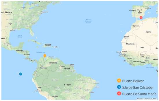 We analyzed three locations: Puerto Bolivar (Colombia)—121336.7 N 715837.4 W, San Cristobal Island (Ecuador)—05207.2 S 892555.8 W, and Port of Santa Maria (Spain)—363456.3 N 61356.1 W. Concerning every location, we have data obtained from weather stations. The weather stations monitor temperature, humidity, rainfall, barometric pressure, solar radiation and wind speed/direction. From all the data loaded by the weather stations, we take exclusive the wind speed. The wind speed is measured and recorded hourly in a two-year database. The wind speed database is the only input random variable for predicting the next day’s wind speed using the proposed hybrid techniques.