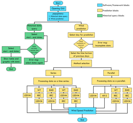 The methods will be analyzed considering the filtering and elimination of the components in the decomposition. As a result, the information of the wind speed trend is preserved and the component with the greatest variation is neglected. The reconstructed term refers to the elimination of the residues of the WT or the empirical decomposition, to then make the prediction using LSSVM. The purpose of eliminating residues is to have a smoothed signal so that the vector machine’s nonlinear regression fits in a better way to the input data of the model. Figure 2 shows a flowchart for the framework implemented in MATLAB.