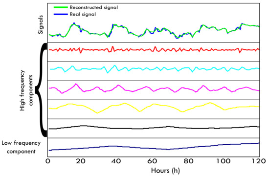 Figure 3 shows a wind speed signal for 120 h (5 days), and for its components after applying the DWT with the command waverec of the MATLAB tool, for 5 levels (five detail components in decreasing order of frequencies, and an approximation component). Mother wavelet db3 was implemented. The actual wind speed performance in that time and the reconstruction of this signal when the higher frequency component is neglected are shown in the first box. Note that even by neglecting the detail component of higher frequencies (), the reconstruction looks very similar to the original signal.