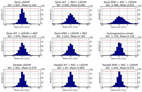 Initially, of the nine prediction methods implemented, the five best cases were selected. This previous selection of methods was made based on the histograms of the prediction errors. In Figure 5, the histograms obtained for each method are shown. Histograms discard those that have a platykurtic form; that is, they have the greatest standard deviations. From the above selection leads us to evaluate in detail the following methods: