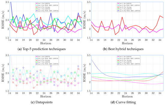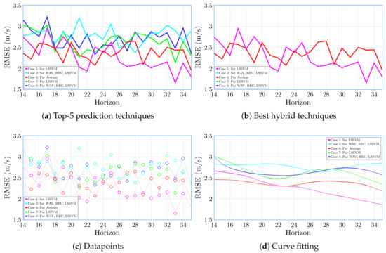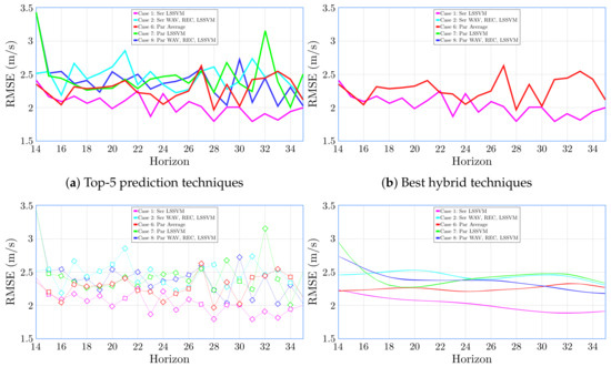 Wind predictions are performed with each of the statistical techniques and make mixtures among them (hybrid techniques). The selected technique will be the one with the lowest RMSE (Equation (1)) where is the predicted data and is the actual data. Individual and hybrid statistical techniques take data in two ways: (1) Series: wind data in each hour of previous days, generating a single vector of data, and (2) Parallel: Wind data in every 24 h during previous days, generating 24 data vectors. Then decomposition, filtering, and reconstruction techniques are combined as follows: