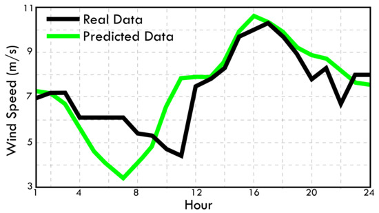 From the tests and results, it can be determined that the method of least average square error is LSSVM. To illustrate the prediction made by the LSSVM method on a given day, a prediction of the following 24 h is made. Figure 9 shows the values predicted by the LSSVM in green and the actual wind values for that particular day in the black.