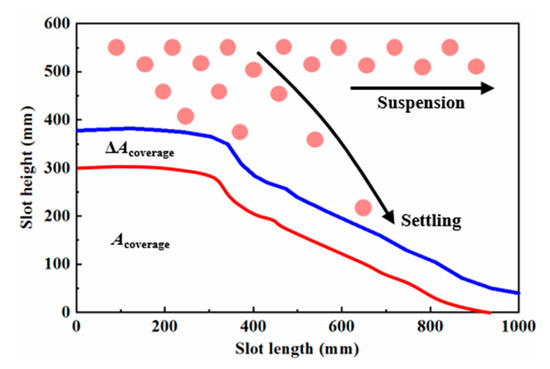 where ΔA(i)coverage is the placement area increment in the ith slot, which is caused by the settling of proppants shown in Figure 2; w(i) is the width of the ith slot; and Vinject is the sand amount injected. In the tests, the placement area increment in each slot was recorded per 10% of the total sand amount injected.