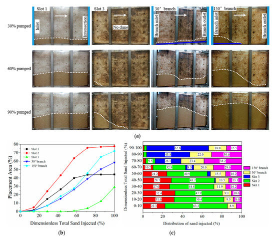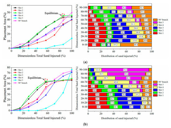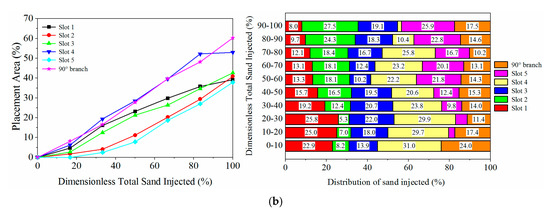 The dune development under a low pumping rate belongs to the case presented in Figure 3a. Figure 4a shows that under a low pumping rate, the dune development in slot 3 (the middle of the primary fracture) was heavily dependent on the dune geometries in slots 1 and 2 (near the inlet), and the dune development in the branch relied on the dune geometry in the primary slots before the intersection. When 56% of sand was pumped, the placement area in slot 3 started to increase dramatically. At that time, the dune height in slot 2 had achieved an equilibrium status, and the placement area in slot 1 reached 43.6%. Similarly, the dunes in slot 4 and the branch began to develop after 78% of sand were pumped, at which the placement area in slot 3 reached a high value of 61.3%. This phenomenon revealed that under a low pumping rate, the dune development in the following fracture (e.g., the branch) depends on the dune geometry in the precedent fracture (e.g., the primary fracture before the intersection).
