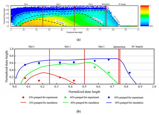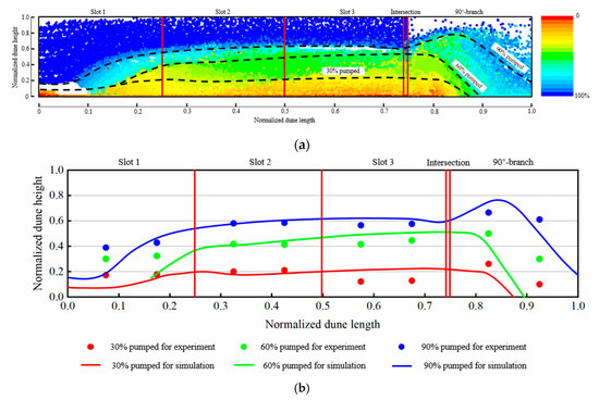 In this section, the model is validated by comparing the simulation results with the experimental results. Cases 1, 4 (with the 90°-orthogonal branch), and 12 (with 45–135°-branches) were simulated using this model. The normalized dune height, taken as the ratio of the dune height to the slot height, was adopted as the verification criterion. Figure 10 and Figure 11 presents the simulation results in cases 1 and 4, respectively. The normalized dune heights in slots 1, 2, 3, and the 90°-branch were observed. In each slot, the heights at one-third and two-thirds of the slot length were chosen for comparison. Experimental results in cases 1 and 4 are presented in Figure 3. For case 1, the dune geometries at 30%, 60%, and 90% of the total sand pumped are identified in Figure 10a and presented in Figure 10b. It was indicated that in slots 2, 3, and the 90°-branch, simulation results agree well with the experimental results. In slot 1, especially at the position closer to the inlet, it can be found that the simulation results slightly deviate from the experimental results, with a maximum deviation of about 34%. This is probably due to the turbulent effect near the inlet, with the dune eroded. For case 4, the dune geometries at the same three pumping stages are identified in Figure 11a and presented in Figure 11b. Similarly, there is a good agreement between the simulation and experimental results in slots 2 and 3. The turbulent effects near the inlet may cause a deviation. Due to the pressure outlet, some particles may flow out of the computation domain, which causes a reduction of the normalized dune height in the 90°-branch. Despite the deviation, it is considered that the numerical simulation model with a 90°-branch used in this study is reliable with the allowable engineering error.