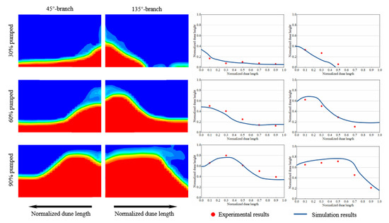 Afterward, the model with 45–135°-branches is validated using case 12. The normalized dune heights in the two branches were observed. In each slot, the heights at the normalized dune length (i.e., the ratio of the dune length to the slot length) of 0.1, 0.3, 0.5, 0.7, and 0.9 were chosen for comparison. Experimental results in case 12 are presented in Figure 8. Also, the dune geometries at 30%, 60%, and 90% of the total sand pumped are identified and presented in Figure 12. It was demonstrated that the simulated results are close to the experimental values with a maximum deviation of less than 25%. Overall, the errors produced from the model with two branches is acceptable in engineering and can be applied for further study.