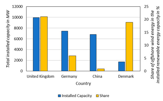 Comparison of offshore wind deployment and share of the offshore wind capacity in renewable generation in major markets (2019) [4,10].