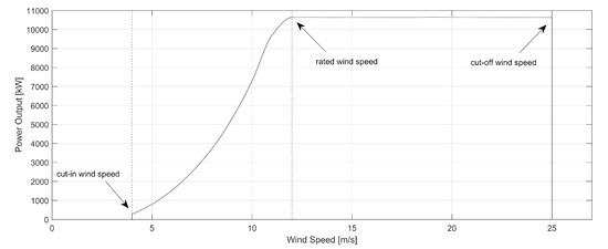Figure 2 displays the power curve of the chosen offshore wind turbine [11]. The cut-in wind speed is 4 m/s, while the cut-off wind speed is 25 m/s. After the cut-in wind speed, the energy of the wind is large enough to turn the rotors and generate electricity. If the cut-off wind speed is reached, the system is shut down to avoid structural damage. The rated wind speed is around 12 m/s; after this point, the power output of the wind turbine is constant.