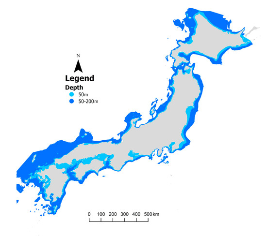 In Figure 3, the suitable locations for offshore wind in Japan are shown. The data were provided by the Japan Coast Guard. The data are given as 500 m gridded bathymetry data [12]. The suitable area is divided into shallow water (<50 m) and deep water (50–200 m). Based on the status of the offshore wind technology, it is assumed that in the shallow water, fixed-bottom structures (e.g., monopiles or jackets) will be used. In deep water, the use of floating technology is assumed [13]. Due to the distance from mainland Japan, Okinawa prefecture will not be considered in this study. Only the Exclusive Economic Zone (EEZ) of Japan is considered. The joint zone with Korea and zones where the ownership is disputed by other countries are not considered. Figure 3 shows that the area suitable for floating wind technology is much larger than the area suitable for fixed-bottom technology. It can also be seen that the seabed is very steep, especially in the north of Honshu and on the east side of Japan. Furthermore, proportional to the coastline, Hokkaido and south-west Japan have the largest suitable areas for offshore wind.