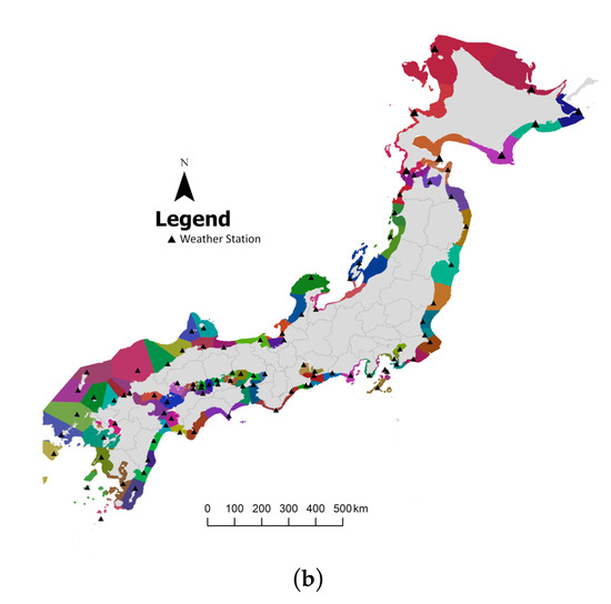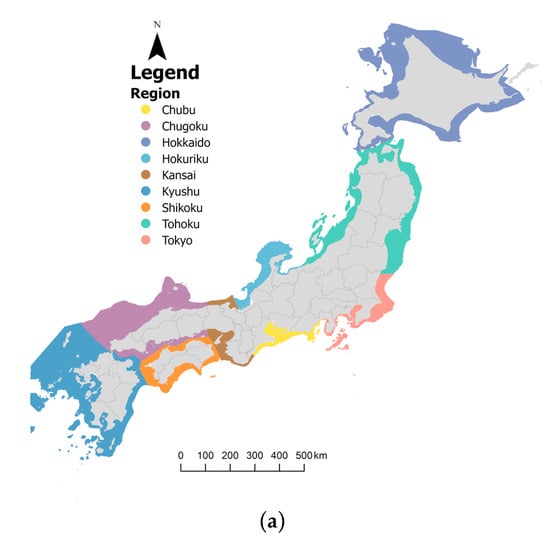 The regions corresponding to the supply areas of the 10 major electric power companies in Japan (without Okinawa) were chosen. The sea area shown in Figure 3 was assigned to each of the service areas of the ten companies. The results are shown in Figure 4a.