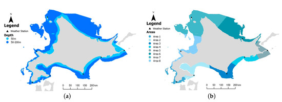 Suitable offshore wind locations in Hokkaido: (a) Divided into fixed-bottom (<50 m) and floating foundation suitable locations (50–200 m), and (b) divided into areas based on the weather station locations.