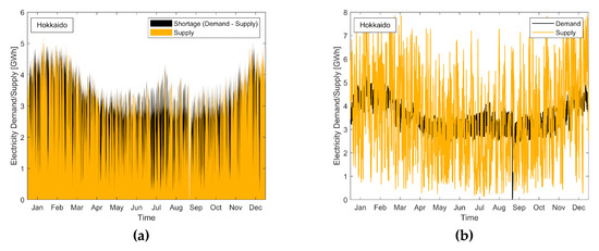 Electricity supply and demand for Hokkaido: (a) Based on 80% of the electricity being supplied by offshore wind without storage (762 turbines) and (b) based on the assumption that the net produced electricity is the same as the net electricity demand (760 turbines).