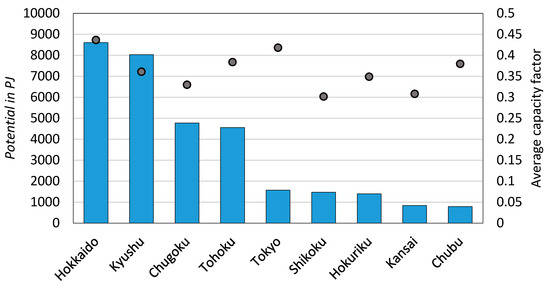 Figure 7 shows the ranking of regions based on their electricity generation potential. Additionally, the capacity factor for each region is shown. The highest capacity factor belongs to Hokkaido, with 0.44, and the lowest belongs to Shikoku and Kansai, with 0.30 and 0.31, respectively.