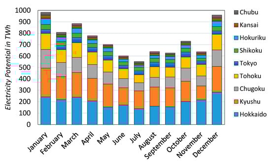 Figure 8 shows that, in the winter months, the produced energy per turbine is higher than the produced energy during the summer months. Peaks are reached in December and January. Generally, this is expected for most countries. Because solar power has its peaks during the summer months, wind power and solar power should be combined to achieve a more constant supply of renewable energy. A combination would lead to smaller amounts of necessary storage and would lower the baseload that has to be supplied by conventional energy sources. As mentioned before, Kyushu and Hokkaido have the highest potential of all the regions, and their total combined potential for every month is higher than all of the other regions combined.
