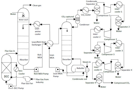 - Capture process: The relevant equipment includes a simple absorption column and desorption column (stripper) with a condenser and a reboiler, a main heat exchanger (LRHX), two pumps (lean pump and rich pump), and a lean amine cooler. The flue gas from the DCC unit enters the absorber at the bottom of the column where the CO2 in the flue gas is absorbed into a counter-current flowing amine solvent, which is monoethanolamine (MEA) in this work. An amine solution rich in CO2 leaves from the bottom of the absorber. The rich pump then pumps it through the LRHX, where it is heated before it flows into the desorber for regeneration. The CO2 is stripped off the amine solution and leaves through the top of the column and through the condenser. The regenerated solvent, the lean amine, is pumped by the lean pump back to the absorber, but first, through the LRHX to heat the CO2-rich stream. It is further cooled to 40 °C by a cooler before entering the absorber at the top to continue another absorption cycle. Even though the water wash section is shown in Figure 1, it is not included in this study for simplicity.