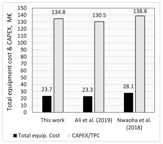 The total installed cost (CAPEX) estimated using the EDF scheme corresponds to the total plant costs (TPC) using the methodology of NETL. It is important to emphasize that the EDF method does not consider the cost escalations and interest accrual during the construction period, the costs for land purchase and preparation, long pipelines, long belt conveyors, office buildings, and workshops, and other costs incurred by the owner.