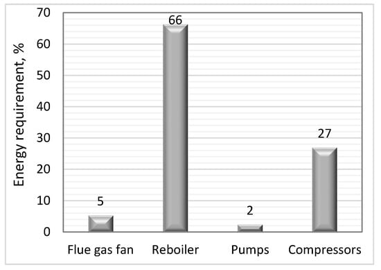 The absorption column and the desorption column were both simulated as equilibrium stages with stage efficiencies (Murphree efficiencies). Each equilibrium stage was assumed to be 1 m high for both columns [11,45]. The industry’s flue gas had a temperature of 80 °C, and it was cooled to 40 °C before entering the absorption column at the bottom at 1.21 bar. The absorber was simulated with 15 packing stages, which was the cost optimum in Reference [17]. Murphree efficiencies of 11–21% were specified from the bottom to the top of the absorption column as in Reference [11]. The desorber was simulated with 10 packing stages, which was also the cost optimum in Reference [17]. For the desorber, a constant Murphree efficiency of 50% for each stage was assumed [11]. The modified HYSIM inside-out algorithm was selected in the columns because it improves convergence [43].