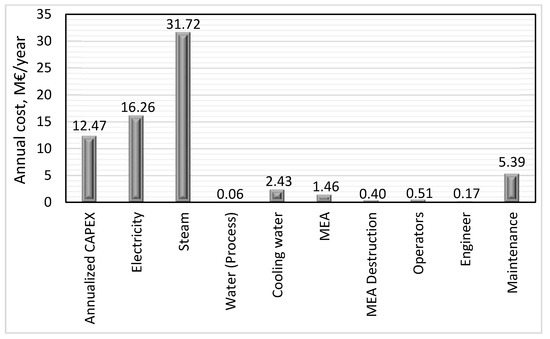 The mass and energy balances on which equipment sizing was based, as well as utilities consumption used for estimation of variable operating costs, were made available from process simulations. The simulations were performed within the scope of the equipment in Figure 1. The simulations are based on the flue gas specifications given in Table 1. They represent a flue gas of a typical cement plant and are obtained from References [11,37]. The simulation method used in this work was the same as that used in References [42,43]. The difference was that in this work, the simulations were performed using Aspen HYSYS Version 10, where the acid gas property package replaced the Amine property package in previous versions. CO2 capture of 85% was assumed [28,32,44].