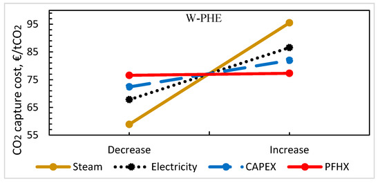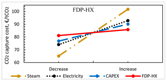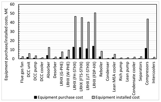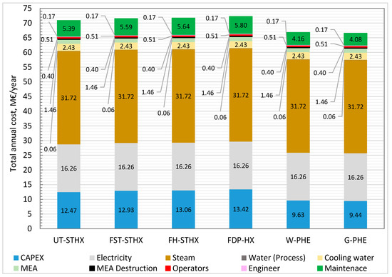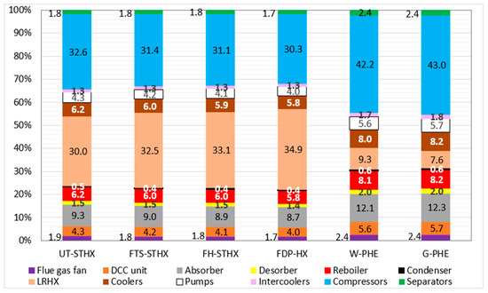 The heat transfer area required is the key design parameter in the initial cost estimate of the general heat transfer equipment. These include the LRHX, reboiler, condenser, and coolers. The heat transfer area is computed from the heat duty (heat transfer from hot to cold stream), overall heat transfer coefficient, and the log-mean temperature difference (LMTD) [63]. The overall heat transfer coefficient (U-value) assumed for the lean/rich heat exchanger scenarios with the STHXs and FDP-HX is 500 W/m2K [45]. This value is close to the 550 W/m2K used by SINTEF (a research organization in Norway) [64]. The overall heat transfer coefficient for the PHEs was conservatively assumed to be 1000 W/m2K. This is because the overall heat transfer coefficient of the PHEs is much higher than that of other exchangers like the STHXs, thereby having an order of magnitude higher surface area per unit volume compared to the STHXs [18,19]. According to Reference [65], the U-value for the PHEs is 2–4 times the STHXs. The welded-plate heat exchanger was assumed to cost 25% more than the gasketed-plate heat exchanger based on information from Reference [18].