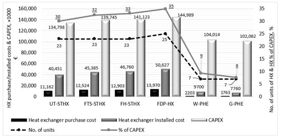 Even though the shell and tube heat exchangers (STHX) are the most robust, especially the floating head type [18], and are the most common heat exchangers [18,19,20] in the process industry, there are other types of heat exchangers that are also popular [18,21]. Examples are the plate and frame heat exchangers (PHE) and double-pipe heat exchangers (including finned double-pipe heat exchanger (FDP-HX)). The majority of available CO2 capture cost studies either do not disclose or merely state the broad classification and not the exact type of heat exchanger employed in the process [1,12,21,22,23]. Examples of broad classifications are shell and tube heat exchangers (STHX) and plate and frame heat exchangers (PHE). However, there are different heat exchangers within these broad classifications, and each has a different cost [18,20,24]. The STHXs have different types of designs and, by implication, different costs and technical advantages [18,20]. Therefore, there is a need to study how each of the popular heat exchangers within their collective classifications affects the process’s cost.