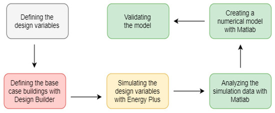 The work was divided into six phases, as expressed in Figure 1. In order to create the most adequate model possible, key design variables of a building had to be chosen. As there was no previous work carried out by the author to define the key variables, the decision was based on previous research carried out in building thermal analysis sector [14,15,16]. Before launching the simulations, design variable ranges and simulation base cases had to be defined. Therefore 4 base buildings were chosen, with a detailed data from building engineering guide book of Spain [17]. The design phase of current work was carried out with Design Builder [18], where the building shape was drawn, given the construction values, and defined the activity and mechanical systems inside. The building base cases were simulated in 12 climate zones of Spain with transient energy simulation software EnergyPlus [19]. Data analyses were done in Matlab [20].