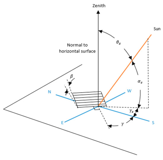 The angle of incidence,, is the angle between the solar beam and the normal to the surface. Zenith angle, , is the angle between solar beam and the vertical [28]. Both angles are represented in Figure 8.